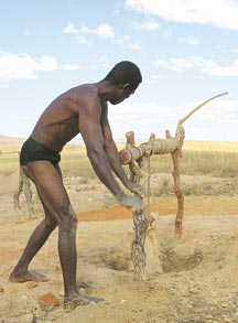 Photo by J. B. Senoble.A miner uses a hand-crank winch to raise gem-bearing gravel to the surface of a mine.
