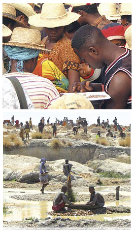 TOP: Trading gemstones in the Ilakaka street market. ABOVE: Gem mining near Manombe.