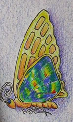 Recently a client fell in love with this unusual and fine black opal (left). Black opal is found at Lightning Ridge in New South Wales, Australia and almost nowhere else. The cutter, Christine Roussel, noting the unusual color pattern in the stone cut it to resemble a butterfly’s wing. We all agreed that the best use of the gem would be to make a butterfly piece, in this case a pendant for his wife. A combination brooch/pendant would have added flexible but as his wife never wears pins he