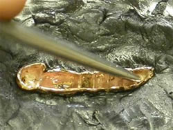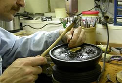 Once cooled, the pitch holds and provides a flexible cushion for the metal. . Set in pitch steel punches can be used to sculpt and expand the metal. Although gold is the most plastic of metals, the cushioning effect of the pitch is necessary to prevent the steel tool from slicing through or cracking the gold.