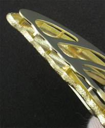 The next step is making of the gallery. One of the ways for a collector to quickly determine if a piece of jewelry is of the ultra-fine class is to flip the piece over and examine the back. Traditionally the finest jewelrythe reverse is completely finished. A finely made gallery such as this one, carefully cut out of 18k gold with a jeweler’s saw, provides the piece with a finished look but allows the repousee work to be seen. The gallery is fitted to and raised slightly above the reverse of the piece like a sandwich and held in place with each post soldered.