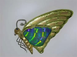Setting the gem is always the last step. With opal this can be a particularly nerve wracking one. Opal is a brittle stone so the setting must be accomplished with great care. One slip of the steel tool and disaster. In this case Mr. Canivet’s hand remained steady. Opps, lets not forget the sapphire eye. And the finished piece, well you be the judge. Note the patina on the wing and body and the finely crafted antenna and feet. Does it look like the sketch, well if you like it in paper and pencil how can you not love it translated into gems and gold!