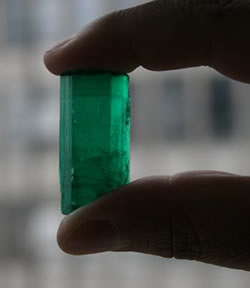 This was a sight I never expected to see. I have traveled all over the world and seen a number of exceptional gemstones but never have I seen a rough parcel of such high quality of anything, anywhere, never mind gem emerald. I pick up one crystal, it is a bit distorted in form but it is clean and the size of my thumb. I hold it up to the light. Completely clean a medium dark slightly bluish green. I do notice an interesting pattern of zoning, several thin dark lines, almost black, that run perpendicular to the length of the crystal.