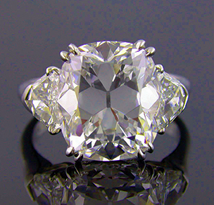 9.07 Carat Type IIa diamond with a mysterious blue body color. Note the large window beneath the table. This stone was identified as a type IIa diamond and graded D IF with no fluorescence by GIA-GTL. Platinum setting with D-IF Trillian side stones. Photo: Jeff Scovil. The Cora N. Miller Collection, Peabody Museum, Yale University. Courtesy: R. W. Wise, Goldsmiths