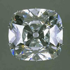The stone I examined was cut in a fashion almost identical to the Regent, a cut known as a baroque brilliant or old European (image left). Stones cut in this fashion are of a different character than the modern brilliant. The crown is higher and the pavilion facets are shorter and broader.
